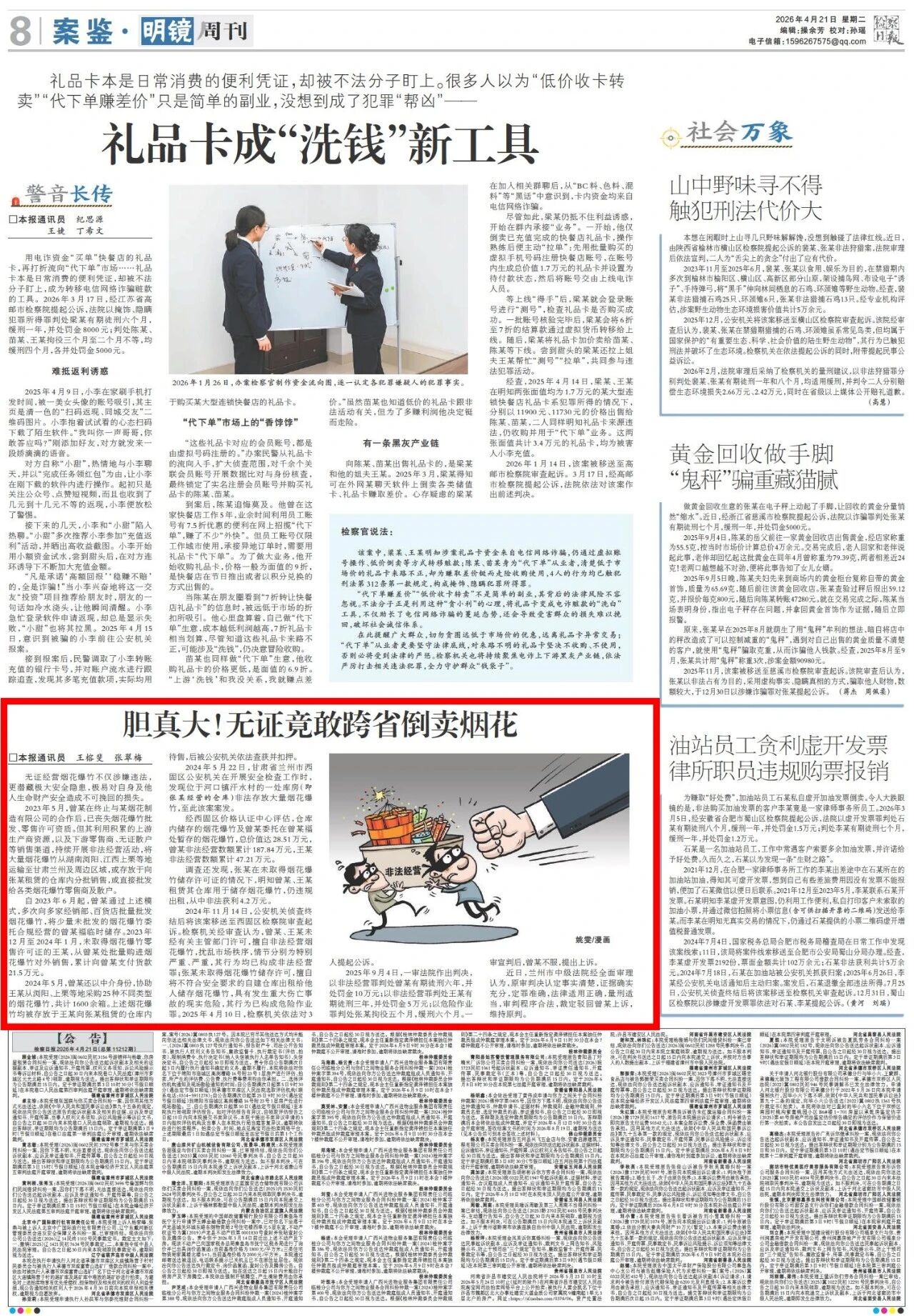 2026年4月21日,检察日报明镜周刊刊发《胆真大!无证竟敢跨省倒卖烟花》。