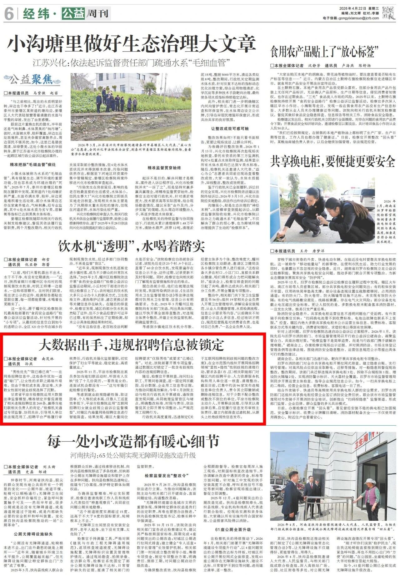 2026年4月22日,检察日报公益周刊刊发《大数据出手,违规招聘信息被锁定》。