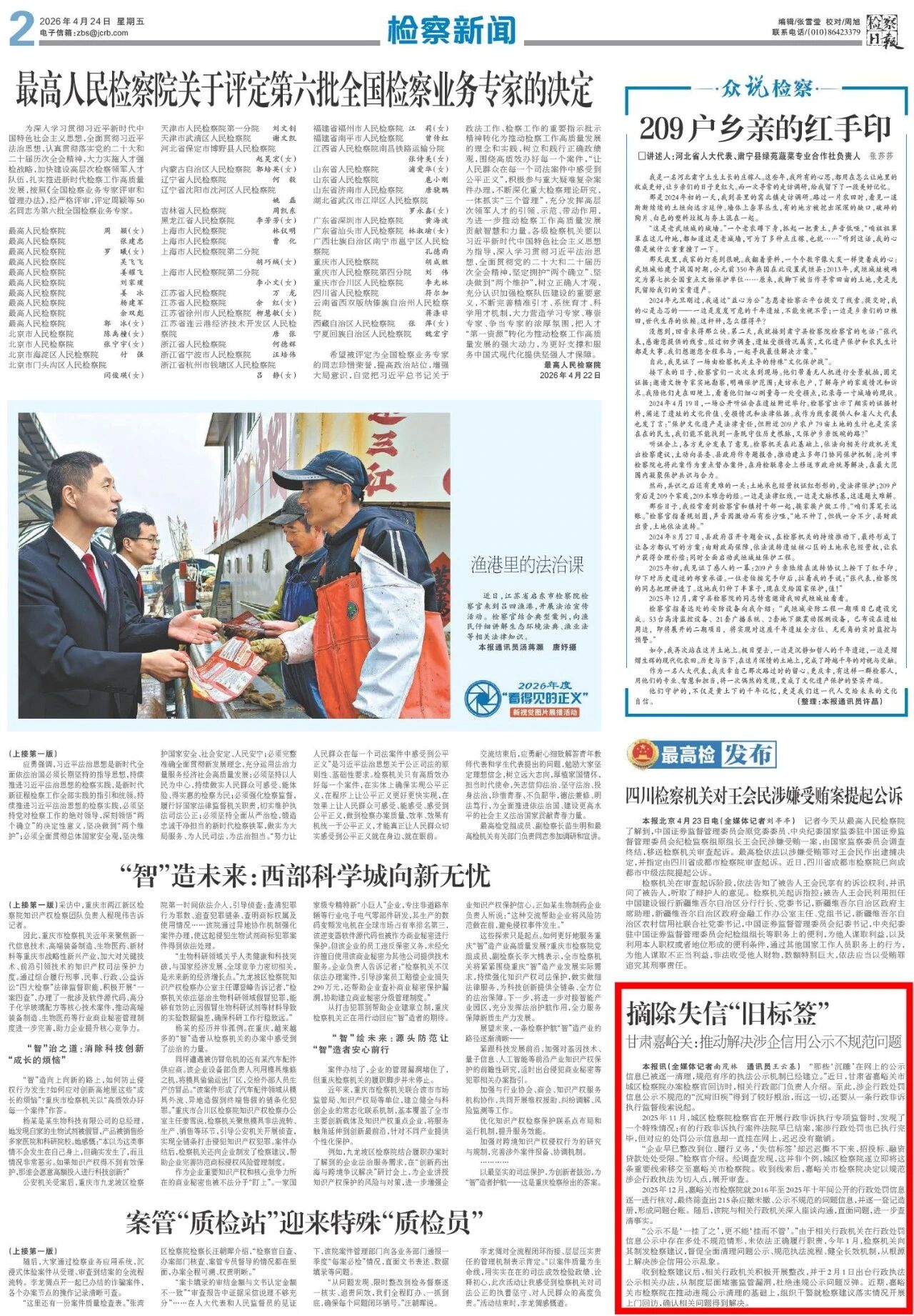 2026年4月24日,检察日报刊发《摘除失信“旧标签” 甘肃嘉峪关:推动解决涉企信用公示不规范问题》。