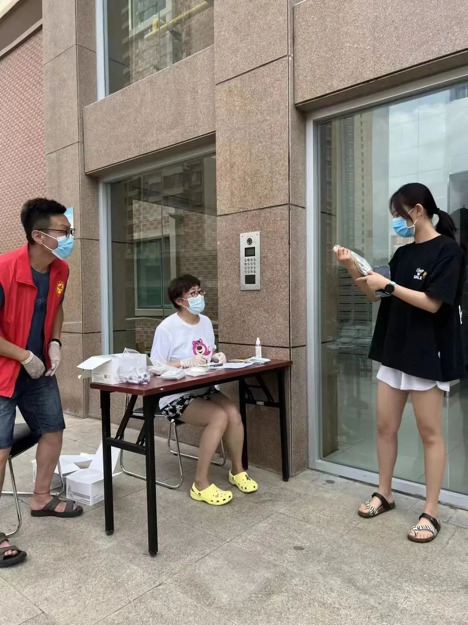 7月14日,李敏与女儿7:00便出了门协助进行核酸采集工作。女儿完成当日的工作回到家中,直到中午开饭,迟迟不见妈妈回家。直到13:30,微信群通知志愿者领取核酸采样工具准备工作时,女儿在楼下才看到了仍在工作的妈妈。她们仅仅进行了简单的人员登记与如何检测的介绍后,母女俩便分头各自忙碌。