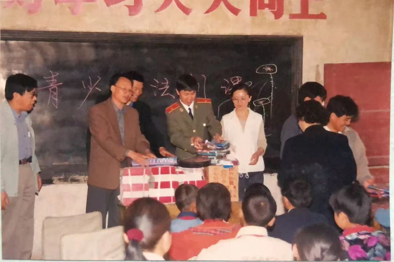 上世纪90年代检察干警深入学校开展法治教育并为孩子们赠送学习用品等物资。