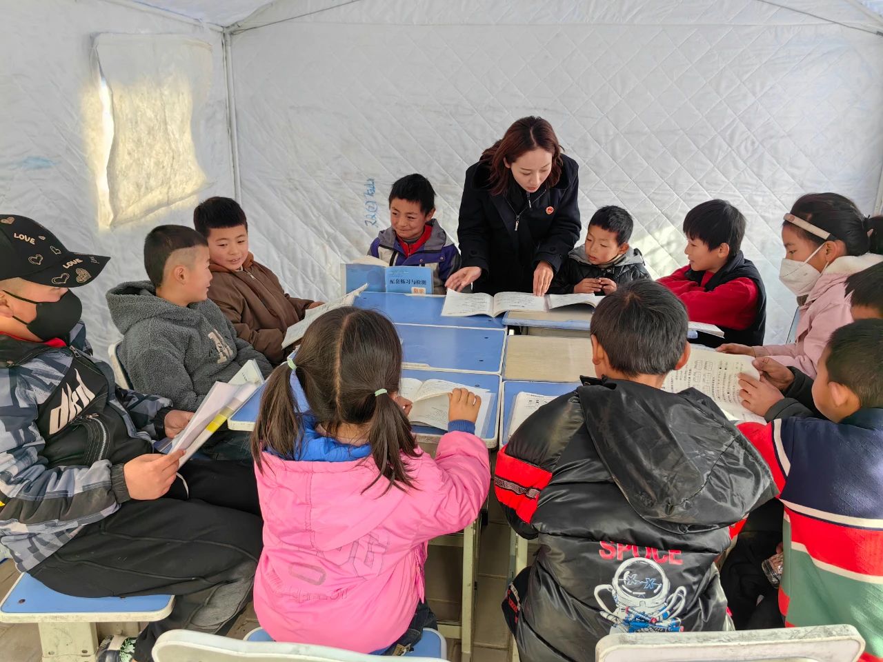 2023年12月,积石山县检察院干警到安置点组织受灾儿童开展唱歌、游戏、才艺表演等活动,疏导孩子们紧张、恐惧情绪,驱散心理阴霾。