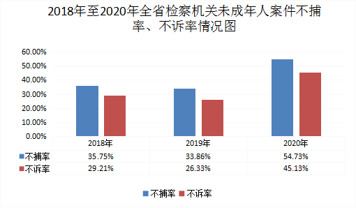 对涉罪未成年人继续感化关爱。对涉罪成年人不捕率为54.73%、不诉率为45.13%,同比分别增加20.87个、 18.8个百分点;对涉罪未成年人社会调查适用率、帮教率全部超过100%对未成年犯罪嫌疑人决定附条件不起诉316人,同比上升134.07%;附条件不起诉考验期满后不起诉126人,同比下降4.55%